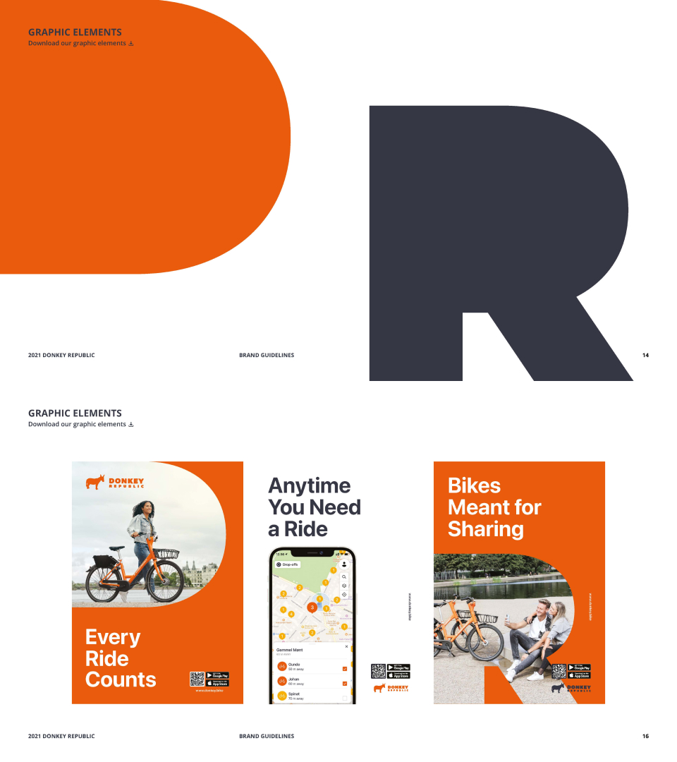 With simple and classic infographics that help readers understand heavy content more easily. Graphs for numbers and icons have a similar visual language and use Donkey Republic’s primary colours to maintain brand consistency.